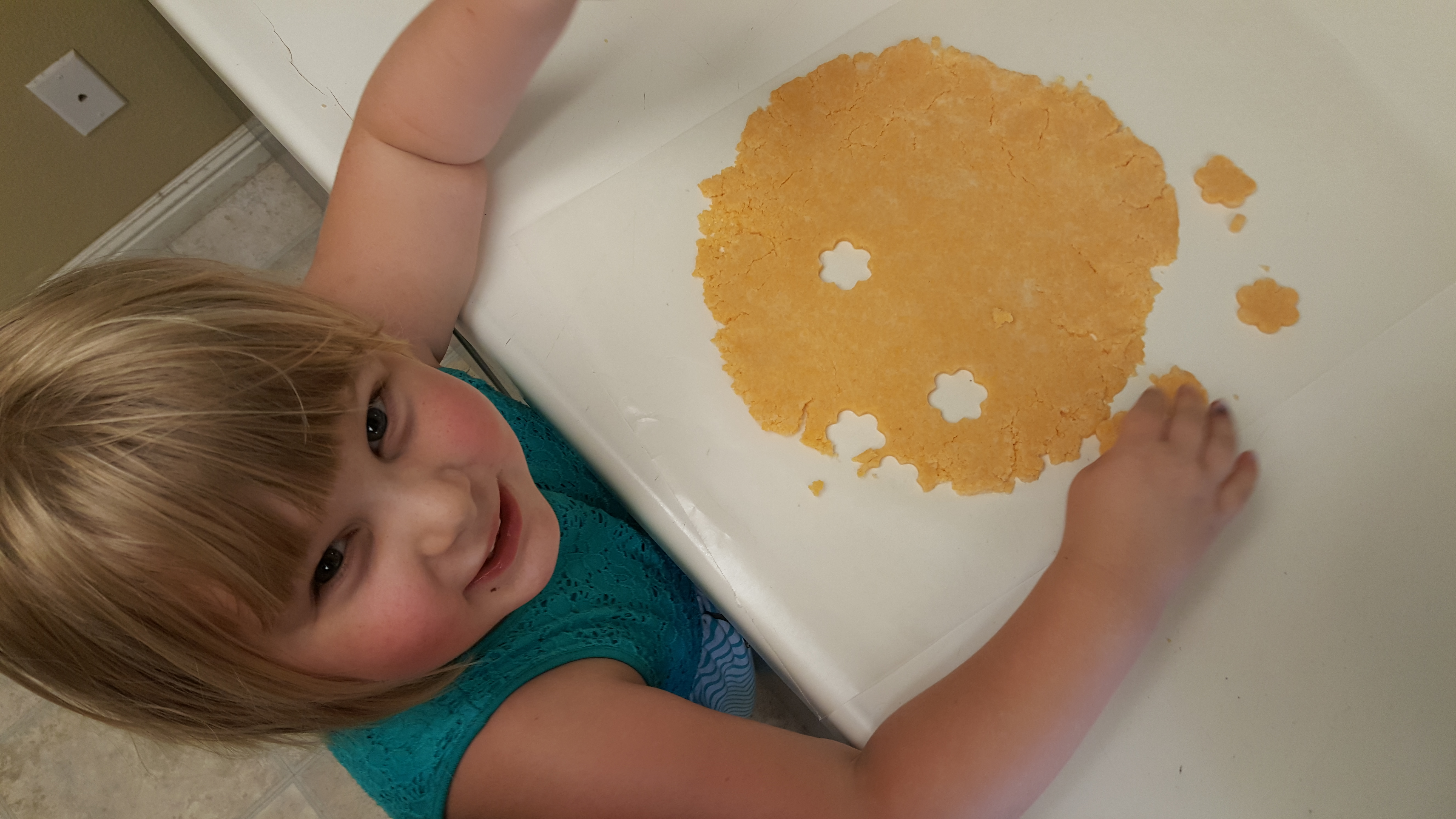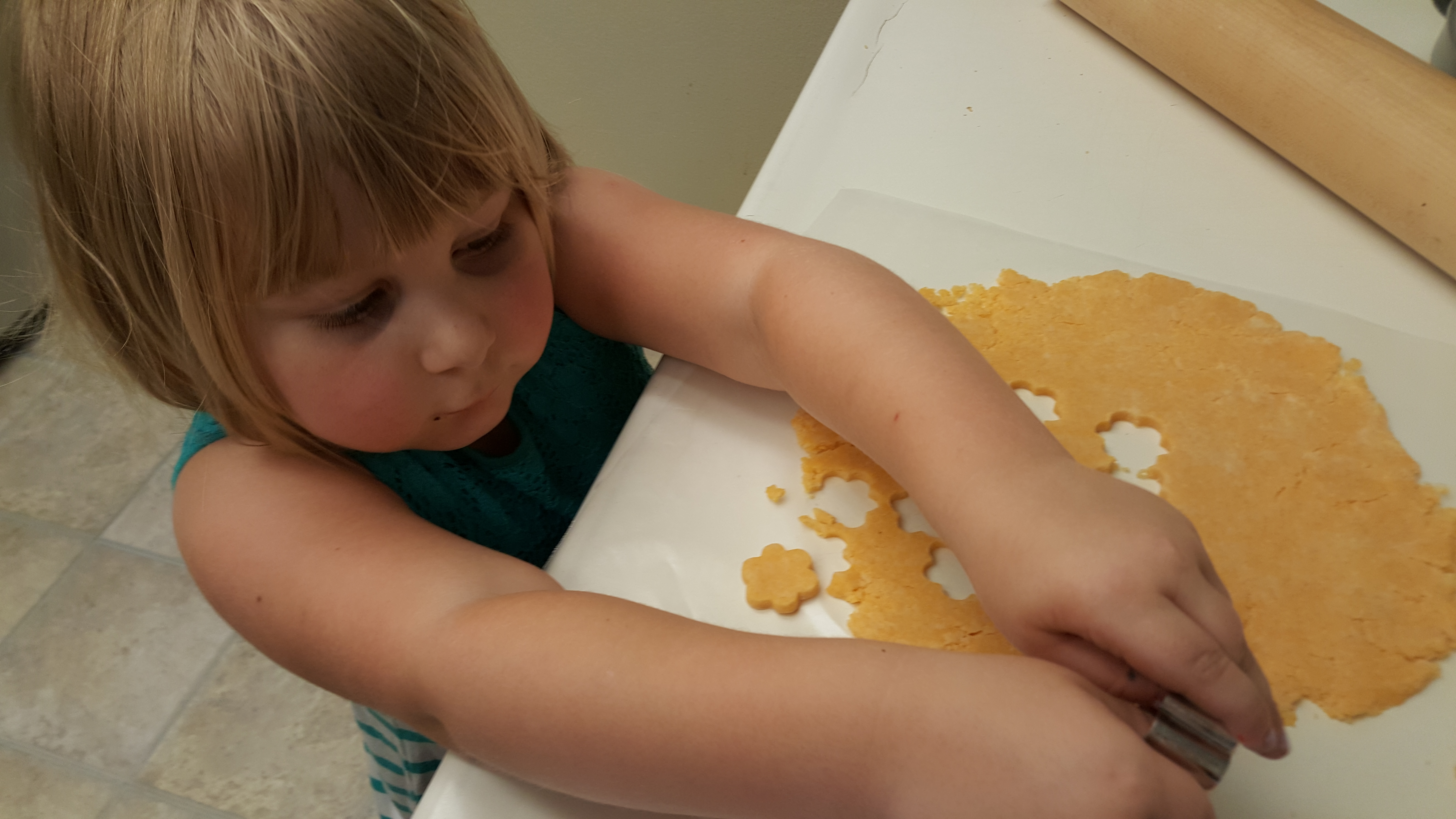 One thing we made were some goldfish crackers. I used this recipe from the Huppie Mama. They turned out great and passed the grandkids’ High Standards Test. We cut ours out with a flower shape. We tried others, but anything with a sharp point didn’t work for us. I imagine regular flour will work just the same as the specialty flour.