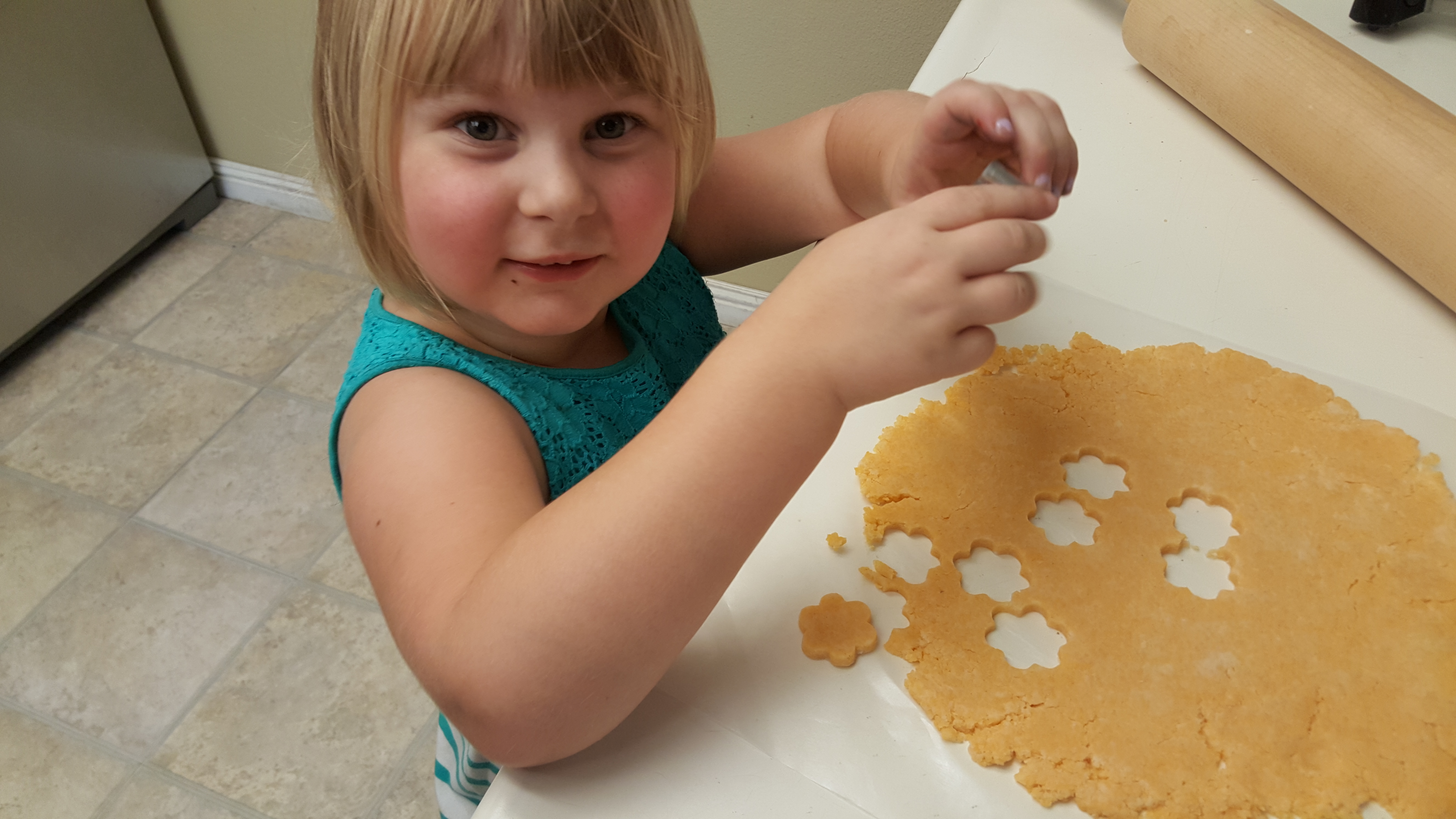 - Refrigerate your dough for about a half hour. At that time, remove half the dough from the refrigerator and allow the other half to continue to chill (grab it when you need it). Roll your dough until you reach the desired thickness, about 1/3″ thick. I recommend flouring your surface first so they don’t stick. The kids loved helping with this part!